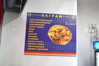 Особое внимание в кафе «Баграм» стоит обратить на мясные блюда. Обязательно попробуйте вкуснейший шашлык и шаурму, кстати, они готовятся на углях, а также аппетитный плов и сочный казан кебаб с бараниной. Также в кафе представлены национальные блюда: гуач, турлу, админок с курицей, дульма, лахмаджун, пиде и другие. Любители более знакомой пищи оценят пирожки, котлеты, фаршированные перцы, салаты и каши. Внимательный персонал поможет определиться с выбором.